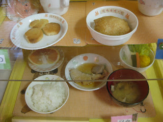 Lunch (below): simmered fish; pumpkin salad with cut vegetables; miso soup with onion and mushroom; grapefruit wedge. Snack (above left): okara cookies. Late snack (above right): inari. |